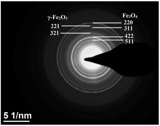 Selected area electron diffraction (SAED) patterns as shown in Figure 4 confirmed the Fe3O4–γ-Fe2O3 core–shell structure of the nanoparticles. Figure 4 shows the SAED pattern for sample S2, which is a representative of the SAED patterns of all samples. The ring-type pattern confirms the polycrystalline nature of the sample. The figure also clearly confirms the presence of Fe3O4 and γ-Fe2O3 crystal planes forming the core–shell structure. The highest intensity peaks (311) for both Fe3O4 and γ-Fe2O3 phases were for d = 0.253 and 0.252 nm, respectively. Hence, the (311) plane shown in Figure 3b corresponds to the superimposed planes of both the phases. The existence of (511), (422), (311), and (220) planes of Fe3O4 corresponding to d = 0.161 nm, 0.171 nm, 0.253 nm, and 0.296 nm, respectively, are confirmed. The presence of the (321) and (221) planes of γ-Fe2O3 corresponding to the d = 0.253 and 0.278 nm, respectively, are verified as pointed out in the figure. This clearly confirmed that the core–shell nanoparticles are Fe3O4/γ-Fe2O3 nanoparticles.