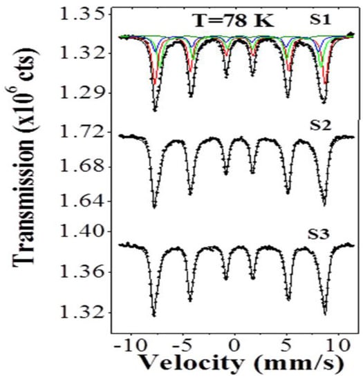 Mössbauer spectra, at 78 K, of the three different nanoparticle samples (the solid curves represent the fitting). The subspectra in the top of the sample labeled S1 represent the detected components. The other samples have similar subspectra.