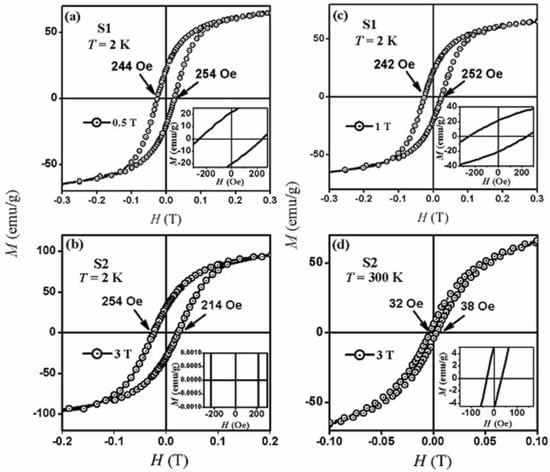 Selected M-H hysteresis loops for samples S1 and S2 are shown in Figure 6. For sample S1, the M-H hysteresis loops are shown at 2 K at field-cooling values of 0.5 and 1 T. For sample S2, the M-H hysteresis loops are shown at field cooling value of 3 T at 2 and 300 K. Typical hysteresis loops were obtained at other temperatures and HFC values for all samples.