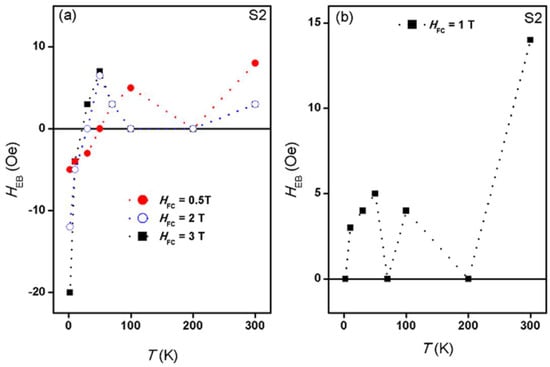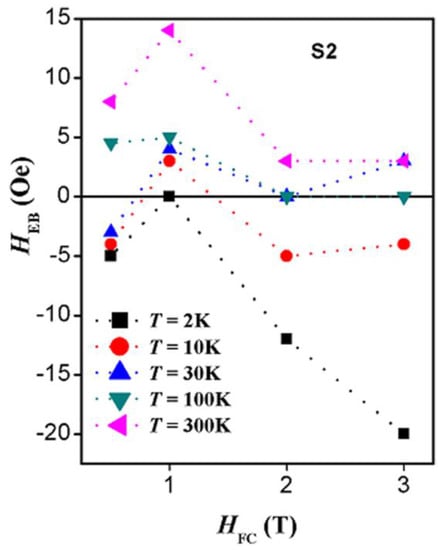 In FM–AFM core–shell nanoparticles, HEB was shown to increase with increasing the field-cooling value and then saturates for field-cooling values above 2 T []. This behavior was attributed to the polarization of the uncompensated spins as the cooling field is increased. In [], exchange bias with small values was observed in very small FeO nanoparticles of average diameters of 3.3 nm. The occurrence of exchange bias in these nanoparticles was attributed to the limited existence of antiferromagnetically compensated spins with in each particle. In FM–AFM systems involving spin-glass-like behavior or spin disorder, with increasing the field-cooling value, HEB decreased after reaching a maximum without saturation [,,]. Our exchange bias results for sample S2 do not contain any of these behaviors. The common observation in our data is that HEB increases with increasing the field-cooling value reaching a maximum and then decreases. With further increase of field-cooling value, HEB keeps decreasing, reaches saturation, or increases slightly.