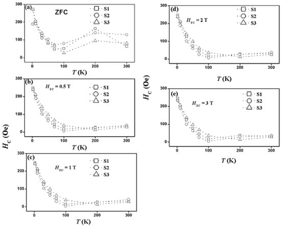 At zero-field-cooling, no exchange bias was observed in all samples at all temperatures. After field-cooling, the main results (as displayed in Figure 7 and Figure 8) are as follows. (a) The complete disappearance of the exchange bias effect in the sample S3 at all field-cooling values and at all temperatures. (b) The occurrence of unconventional exchange bias in samples S1 (with a maximum value of 5 Oe) only at 2 K and at 10 K at particular field-cooling values. At 2 K, the exchange bias was observed only at the smallest field-cooled values of 0.5 T, and 1 T whereas at 10 K, it was observed only at 0.5 T. (c) The occurrence of unconventional exchange bias in samples S2 (with a maximum value of 20 Oe) at all temperatures and all field-cooling values. The exchange bias effect appears after field-cooling from room temperature (300 K) which is much lower than both the Tc of the shell (which is above 820 K) and the TC of the core (which is around 850 K) [,]. (d) The exchange bias in sample S2 has a nonmonotonic behavior with temperature as well as with field-cooling. This is opposite to the familiar exchange bias behavior in other systems where exchange bias decreases with temperature and increases with the increase of the field-cooling value. (e) The exchange bias in sample S2 did not vanish at 300 K at all field-cooled values. (f) Negative as well as positive exchange bias were observed in sample S2. The switch from negative to positive exchange bias in this sample occurred at temperature of 50, 30, and 21 K, for field-cooling values of 0.5, 2, and 3 T, respectively. Hence, we can state that in this FIM–FIM core–shell structure, a shell thickness of 3 nm represents a critical thickness at which the exchange bias occurs nearly at all temperatures and at all field-cooling values. In addition, 1 T is a critical field-cooling value in sample S2, where only positive exchange bias occurs and the exchange bias displays a peak or a dip at nearly all temperatures.