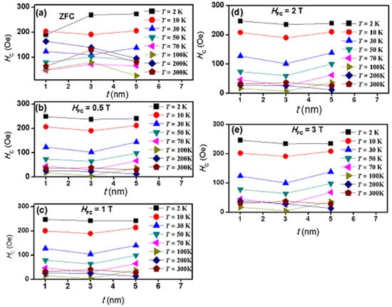 The coercivity as function of shell thickness at several temperatures in the ZFC state and in the FC state at several field-cooling values.