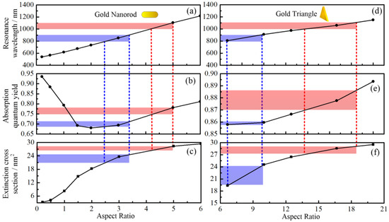 Correlation between resonance wavelength, absorption quantum yield, and extinction cross section with the aspect ratio, respectively. (a–c) nanorod; (d–f) nanotriangle. The color bars indicate the results corresponding to commonly used laser wavelengthes.