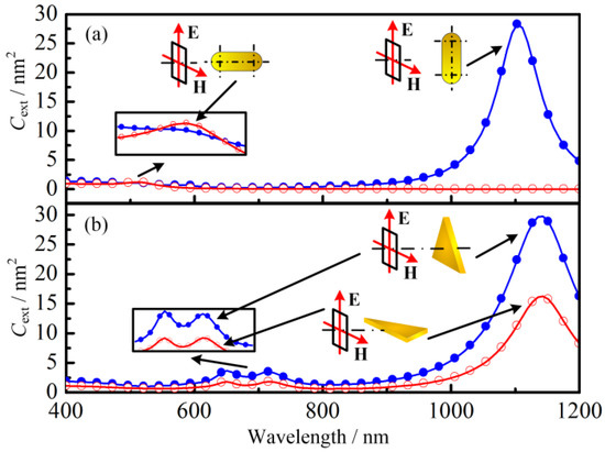 Extinction cross section of (a) gold nanotriangles (GNTs) and (b) gold nanorods (GNRs) with different incident direction of electromagnetic waves. The results are the average value of extinction cross section when the incident electric field direction is horizontal and vertical. The insets show the partial enlarged views of local maximum. E and H stands for electric and magnetic fields, respectively.