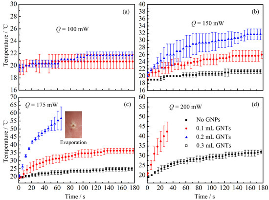 Temperature changes of biological tissue after injecting different amount of GNT solution: (a) Q = 100 mW; (b) Q = 150 mW; (c) Q = 175 mW; (d) Q = 200 mW.