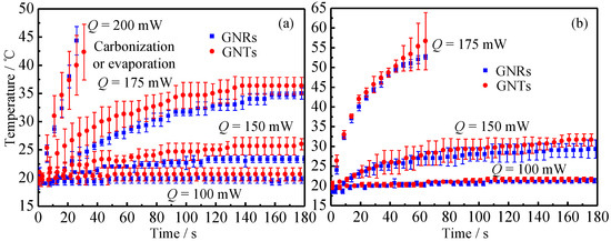Figure 7 shows the comparison of temperature change of tissue injected with GNRs and GNTs. The mass concentration of GNR and GNT solutions are the same. Therefore, under the same injection dose, the total volume of GNRs and GNTs inside the tissue should be the same.