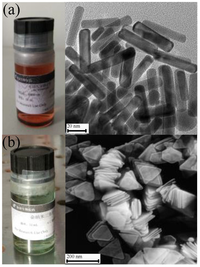 The GNT and GNR solutions were purchased from the Shanghai So-Fe Biomedicine Co., LTD. (Shanghai, China), the mass concentration of which was 0.1 mg/mL for both. The aspect ratio of GNRs is 6.5:1. There are two absorption peaks in the UV-Vis spectra (Beijing, China) of a GNR solution, which are 510 and 1060 nm. For the GNTs, the side length of triangular cross section is 140 ± 25 nm. The thickness of GNTs is 8 ± 2 nm. There are three absorption peaks in the UV-Vis spectra of GNT solution, which are 401, 500, and 1060 nm. Figure 8 shows the scanning electron microscope (SEM) image of GNR and GNT solutions.