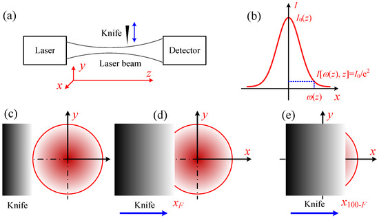 Step 2. The knife was moved slowly along the radial direction of the laser beam while monitoring the intensity of the laser at the same time. When the total energy received by the detector reached F% (shown in Table 2) of the total laser intensity, we recorded the position of the knife as xF, as shown in Figure 9d;