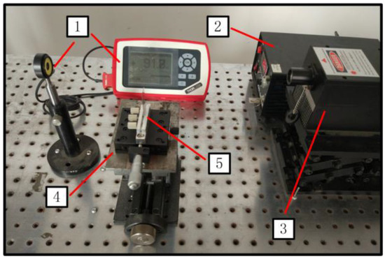 The experimental system using the knife-edge method to measure the radius of laser beam is shown in Figure 10. The laser used in the present research was purchased from Changchun New Industries Optoeletronics Technology Co., Ltd, and it is a diode laser at wavelength 1064 ± 1 nm (MIL-N-1064, Changchun China). The detector was purchased from Thorlabs Inc. (Shanghai, China) It has a handheld digital power meter (PM100D, Shanghai, China). and an energy meter (S120VC, Shanghai, China). The detectable wavelength range is 20–1100 nm. The measurement uncertainties are: ± 3% (440–980 nm); ± 5% (280–439 nm); ± 7% (200–279 nm, 981–1100 nm).