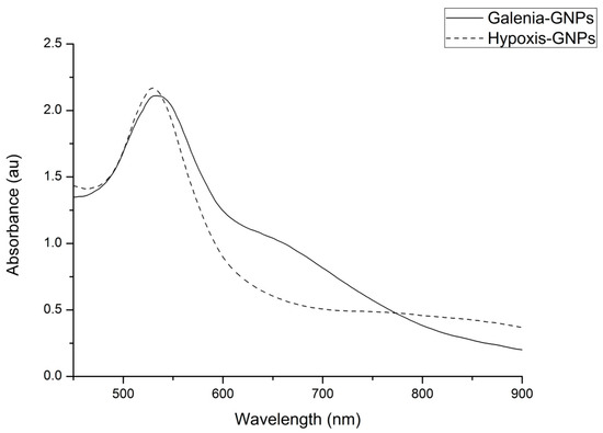 To understand the stability of the GNPs, the zeta potential values, measured immediately after the synthesis, were obtained using the Zetasizer. Hypoxis-GNPs and Galenia-GNPs demonstrated negative zeta potential values of −22 and −20, respectively. These negative values can estimate the long-term stability of the GNPs in a solution, as they can provide enough repulsion forces between the particles and prevent their agglomeration [53].