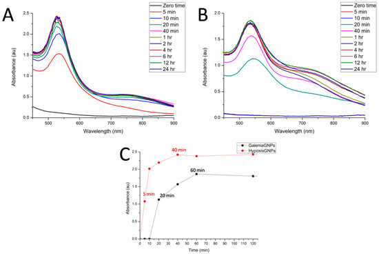 The UV-Vis spectra recorded as a function of time of GNPs synthesized from (A) H. hemerocallidea and (B) G. africana; (C) shows the λmax values of the two GNPs as a function of time.