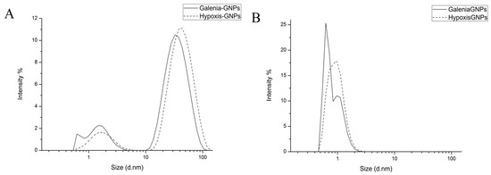 DLS distribution curves of GNPs’ hydrodnamic diameter by (A) intensity and (B) number of GNPs.
