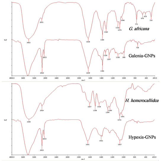FTIR spectra of H. hemerocallidea and G. africana and their respective GNPs.