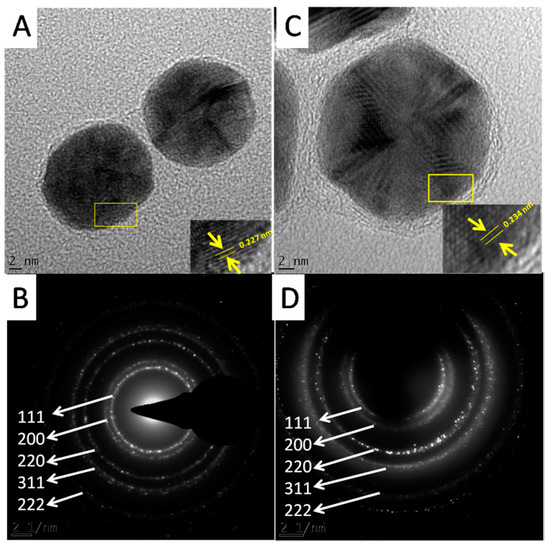 The HRTEM analysis also revealed the crystalline nature of the GNPs. Figure 8A,C show the lattice fringes of the two GNPs. The shortest lattice distances were 0.234 and 0.227 nm for Hypoxis-GNPs and Galenia-GNPs, respectively (Figure 8A,C). These values correspond approximately to the interplanar spacing between (111) planes of gold [46]. The crystalline nature of the GNPs was also confirmed by the selected area electron diffraction (SAED). The bright rings were found to correspond to the (111), (200), (220), (311) and (222) planes of the gold (Figure 8B,D).
