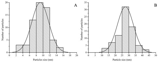 Particle size distributions of (A) Galenia-GNPs and (B) Hypoxis-GNPs as obtained from the HRTEM images.