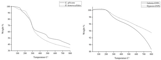 TGA data for H. hemerocallidea and G. africana and their respective GNPs.