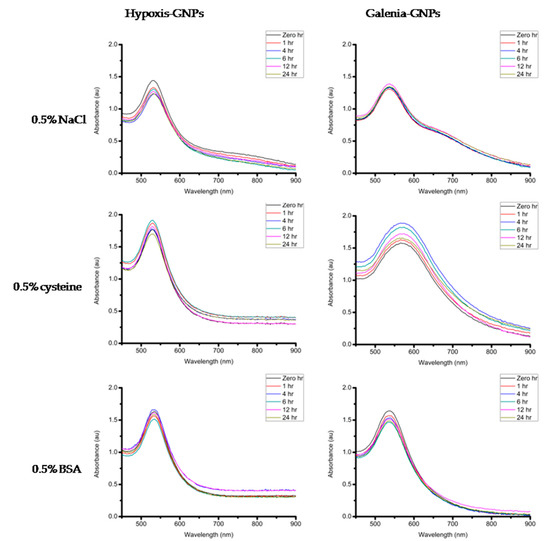 If these GNPs are to be considered for biomedical applications, they must maintain their stability in different buffer solutions (e.g., Sodium Chloride (NaCl), cysteine and Bovine Serum Albumin (BSA)). The stability of the GNPs was measured after incubation with the aforementioned buffer solutions as well as the growth media used in the biological assays in this study (Dulbecco’s Modified Eagle’s Medium (DMEM) supplemented with 10% Fetal Bovine Serum (FBS) and Nutrient broth). The GNPs were incubated at 37 °C with DMEM and Nutrient broth in order to determine the effect of the media on the stability of the GNPs under experimental conditions. A minimal change in the UV-Vis spectra of the GNPs is an indication of the GNPs stability. When the GNPs lose stability they may precipitate, which can be observed by the significant red shifts and broadening of the UV-Vis bands [54]. After measuring the UV-Vis of the two GNPs incubated with different buffers and the biological media over a 24 h period, it was observed that these GNPs were generally stable in most of the buffer conditions tested with no changes in the UV-Vis bands (Figure 12). One exception was the effect of 0.5% cysteine on Galenia-GNPs, which caused the UV-Vis bands to become broader at all the time-points. Nonetheless, Galenia-GNPs showed excellent stability in DMEM that usually contains cysteine and other amino acids but at lower concentrations.