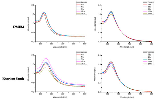 To measure the effect of different aqueous buffer solutions (e.g., 0.5% NaCl, 0.5% cysteine and 0.5% BSA) on the stability of the biogenic GNPs, 100 µL of the GNPs solutions were mixed with 100 µL of the buffer solutions in a 96-well microtitre plate. The stability of the GNPs was also evaluated in DMEM (supplemented with 10% FBS) and Nutrient broth. The stability of the GNPs was monitored by measuring the UV-Vis spectrum (between 450 and 900 nm) of the samples at 1, 4, 6, 12 and 24 h after mixing the GNPs with the buffer solutions or the media.
