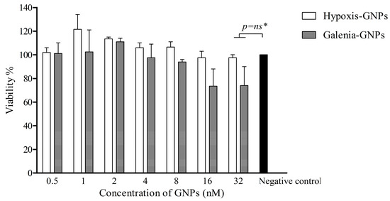 The effect of the GNPs on the cell viability of KMST-6 as determined by the MTT assay. * No statistically significant difference (p > 0.05) compared to the negative control.