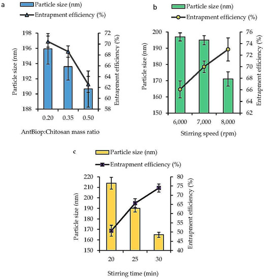 The stirring speed and stirring time could affect particle size and the rate at which chitosan formed a viscous gel to ionically gelate the AntBiop. Thus, the increase in these factors and the amount of cross-linking agent, sodium tripolyphosphate, were found to maximize the incorporation and the entrapment efficiency of the AntBiop in the Chit-AntBiop-NPs and to lead to smaller sized nanocapsules. In a similar finding, the stirring speed and stirring time were optimized to produce chitosan nanoparticles with a small particle size and high EE [32]. However, a prolonged stirring rate beyond the optimum point may lead to leakage of the AntBiop and low EE [33].