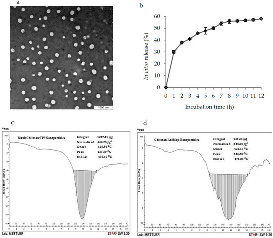 Physical appearance, in vitro release profiles and differential scanning calorimetry (DSC) of the Chit-AntBiop-NPs; (a) transmission electron microscopy (TEM) images of Chit-AntBiop-NPs, (b) In vitro release profiles of AntBiop from Chit-AntBiop-NPs in PBS pH 7.4 (c) DSC curve of the blank chitosan nanoparticles and (d) DSC curve of the Chit-AntBiop-NPs.
