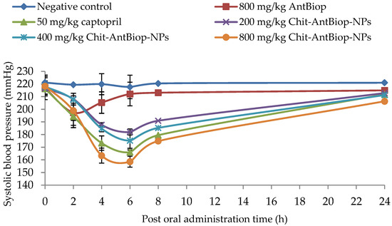As shown in Table 2 and Figure 4, a single oral dose of the unencapsulated biopeptides/AntBiop, captopril and varying doses of Chit-AntBiop-NPs exhibited a systolic blood-pressure-lowering effect within 24 h of their administration. The oral administration of unencapsulated biopeptides at 800 mg/kg significantly (p < 0.05) reduced systolic blood pressure (SBP) by 19.78 ± 9.966 mmHg at 2 h and 11.78 ± 8.483 mmHg at 4 h respectively (Group II).