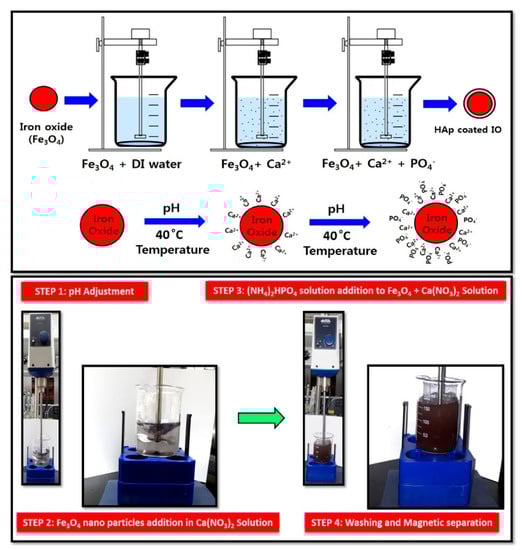 Synthesis of hydroxyapatite coated iron oxide (IO-HAp) nanoparticles.