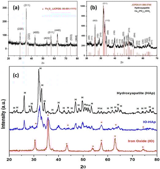 X-ray diffraction (XRD) analysis of (a) IO, (b) HAp and (c) comparing HAp, IO-HAp, and IO nanoparticles.