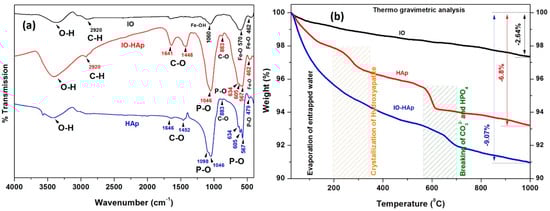 (a) FTIR and (b) Thermogravimetric analysis of IO, HAp and IO-HAp nanoparticles.