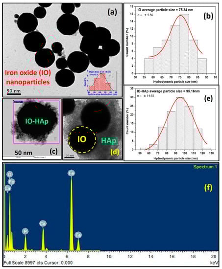 The FETEM study revealed that the synthesized IO nanoparticles are spherical in structure and well dispersed, as presented in Figure 4a. The particle size distribution of synthesized IO nanoparticles shows spherical morphology with an average size 62.14 ± 10.8 nm. The HAp nanoparticles coating over IO nanoparticles are shown in Figure 4c,d. The EDS analysis confirmed the presence of Fe, Ca, P, and O with Ca/P ratio of 1.70 (Figure 4f). The synthesized IO and IO-HAp nanoparticles average hydrodynamic particle size diameters were studied by laser mediated dynamic light scattering method (Figure 4b,e). The average size distribution of IO nanoparticles was determined as 75.34 ± 5.56 nm, and for IO-HAp was 95.16 ± 14.92 nm, which is very close resemblance with TEM calculated data.