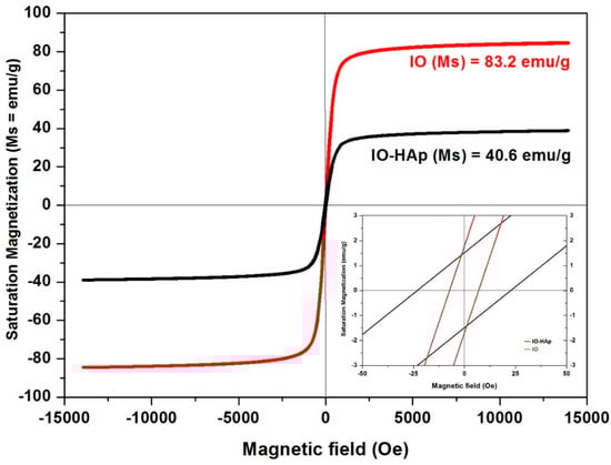 Magnetization curve of IO and IO-HAp nanoparticles (inset corresponds to a low-field region of IO and IO-HAp nanoparticles magnetic saturation curve to identify the coercivity and remanent magnetization).