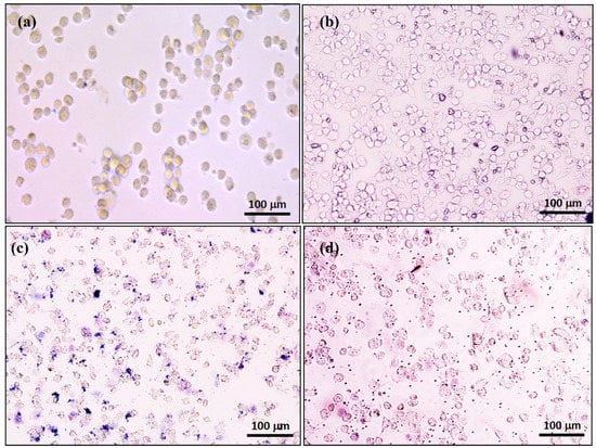 Trypan blue cell viability study of MG-63 cells incubated (a) without any nanoparticles as control (b) HAp, (c) IO, and (d) IO-HAp nanoparticles for 24 h with a concentration of 100 µg/mL.
