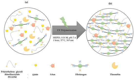 A schematic of the fibrin/PEO-SAm IPN synthesis is shown in Figure 1. They were synthesized according to previously described procedures [39,40] adapted to these materials.