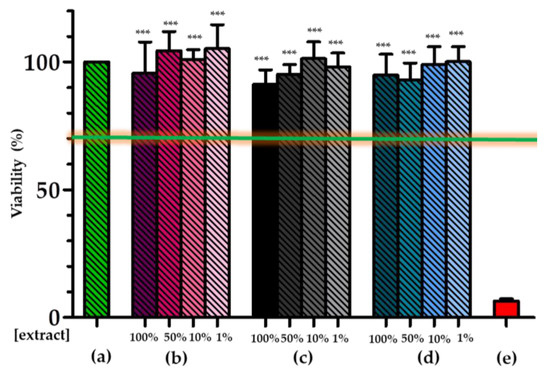 OD490 nm extract: mean value of the measured optical density obtained with cells treated with the extracts of the test samples. OD490 nm non-treated cells: mean value of the measured optical density obtained with non-treated cells.