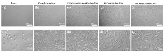 Morphology of cells exposed to IPN extracts. Phase contrast images of L929 cells three days following the cytotoxic assay, with magnifications (×10) (a–e) and (×40) (f–j). L929 cells cultured with: (a,f) extracts from latex (positive control for cytotoxicity); (b,g) no extract (negative control for cytotoxicity); (c,h) extracts from PEO(5%)coHSAm(5%)fb(0.5%) IPNs; (d,i) extracts from PEO(10%)fb(0.5%) and (e,j) from HSAm(10%)fb(0.5%) IPNs.