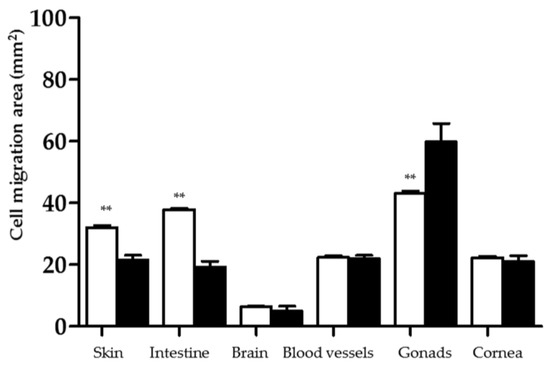 Cells from skin and intestine tissues may have more affinity for fibrin than the other cells investigated as they migrated more significantly on PEO(5%)coHSAm(5%)fb(0.5%) IPNs than on Thermanox® (32.07 ± 1.20 mm2 vs. 21.65 ± 2.35 mm2; 37.87 ± 0.75 mm2 vs. 19.28 ± 3.20 mm2, respectively). Cells from gonad tissues migrated less on PEO(5%)coHSAm(5%)fb(0.5%) IPNs than on Thermanox® (43.11 ± 1.28 mm2 vs. 59.82 ± 10.26 mm2). No significant differences were observed between PEO(5%)coHSAm(5%)fb(0.5%) IPNs and Thermanox® for the other explants.