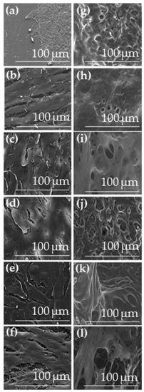Due to their high water content, cell-coated PEO(5%)coHSAm(5%)fb(0.5%) IPNs were observed using ESEM equipped with a Peltier cooling device (Figure 7g–l). Control samples (tissue-culture treated coverslips deposited on explants) were analyzed by scanning electron microscopy (SEM) (Figure 7a–f). The different cell types anchored on the Thermanox® surfaces and adopted their characteristic morphologies such as skin cells in desquamation (Figure 7c), squamous intestinal cells (Figure 7b) or cornea cells (Figure 7f). The cell shapes were more difficult to distinguish on the IPN surfaces due to uneven gel surfaces.