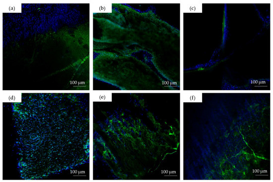 CLSM images (×20) of: (a) brain; (b) intestine; (c) skin; (d) blood vessels; (e) cornea; and (f) gonad cells on hydrogel surfaces after organotypic culture. Cell nuclei (blue) were labeled using Hoechst 33,342 (blue), and the fibrin network (green) was stained using an FITC conjugated to anti-fibrinogen antibody.