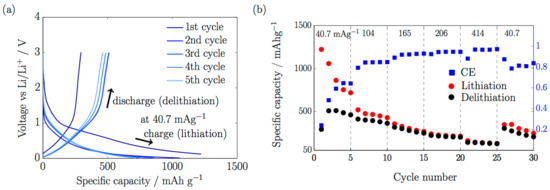 (a) First five cycles at 40.7 mA·g−1 during charge (lithiation) and discharge (delithiation); (b) Rate capability with cycle number during charge (red circles) and discharge (black circles), and coulombic efficiency (blue squares).