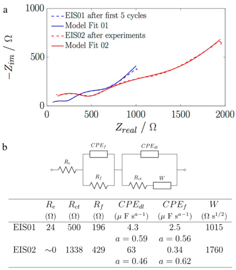 (a) Electrochemical impedance spectroscopy (EIS) measurements after the first five cycles and at the end of the experiments; (b) Corresponding equivalent circuit values from the model fit.