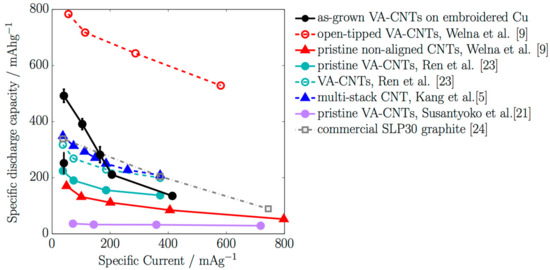 The specific capacities (Figure 5) and mass loadings obtained with as-grown VA-CNTs on Cu embroidered current collectors were compared with the state-of-art literature and commercial graphite [25]. The specific capacities as a function of the specific current obtained with our as-grown VA-CNTs were larger than the values found in the literature, and the approach offers more possibilities since, for instance, no post-treatment was applied.