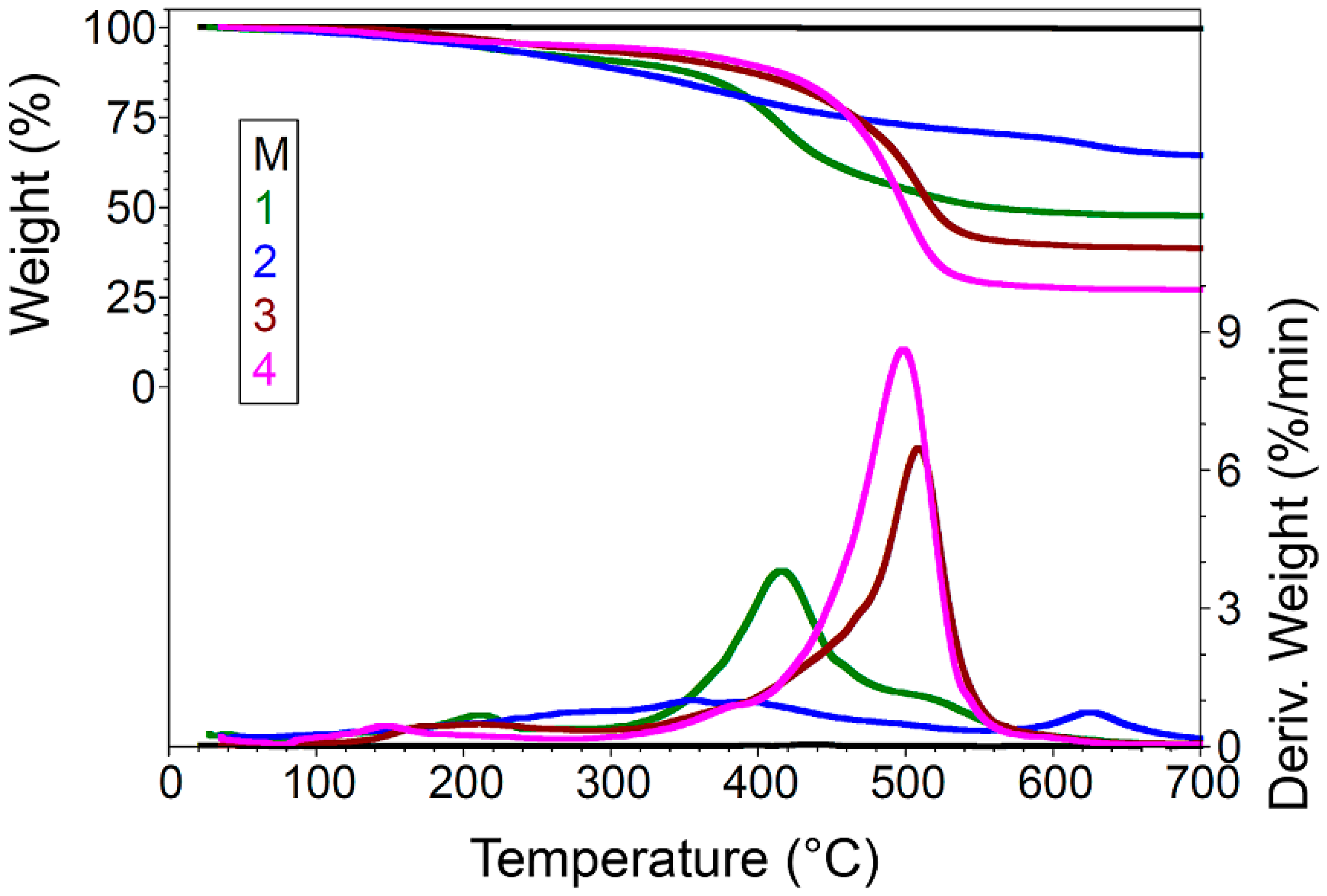 | Sample No. | 40–275 °C | 275–575 °C | 575–700 °C | Residue at 700 °C | |||||