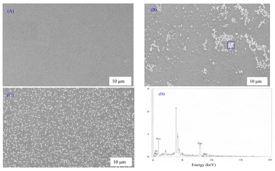 Scanning electron microscopy (SEM) image for (A) CSN1; (B) CSN2; (C) CSN3 and (D) EDAX for white specks inside the blue box. The white spots appearing on the film surface are attributable to Cu metallic particles.