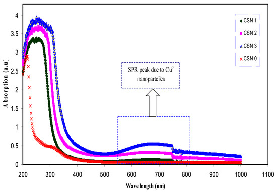 Absorption spectra of pure CS and CS:CuI solid films. The surface plasmonic resonance (SPR) peak appearing at approximately 667 nm for CS:CuI samples is related to the existence of Cu metallic nanoparticles.