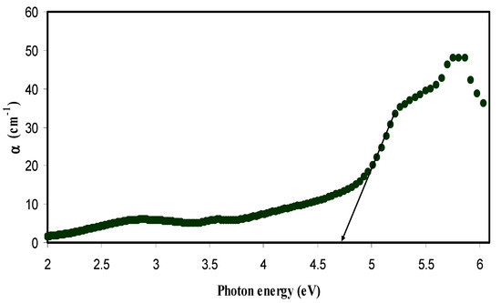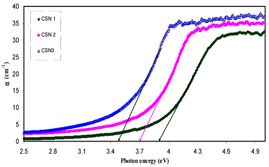 where d is the thickness of the sample and A is the absorption data. Figure 3 and Figure 4 illustrate the absorption coefficient as a function of photon energy for pure CS and CS nanocomposite samples, respectively. Absorption coefficient is defined as the fraction of the power absorbed in a unit length of the medium [36]. It can be clearly seen that the absorption edge of the CS shifts toward the lower photon energy for the samples containing Cu nanoparticles. Essential information about the band structure and the energy band gap in the crystalline and non-crystalline materials can be obtained from the optical absorption spectra determination [37]. The shift towards the lower photon energy reveals the reduction in the optical band gap of the CS nanocomposite samples. Absorption edge values were estimated from the intersection of the extrapolation of the linear relationship. The obtained absorption edge values are presented in Table 1. It is clear that the absorption edge decreases from 4.7 eV for pure CS to 3.51 eV for CS incorporated with 12 wt. % CuI. Such significant changes in absorption edge values are evidence of the occurrence of changes in the band structure of the CS nanocomposite samples.