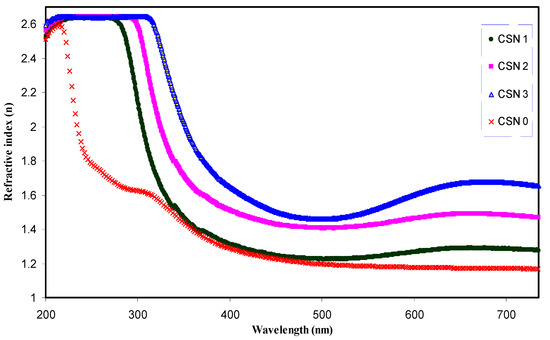 Refractive index as a function of wavelength for pure CS and doped CS samples.
