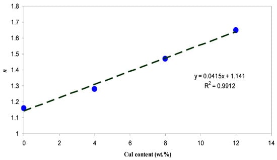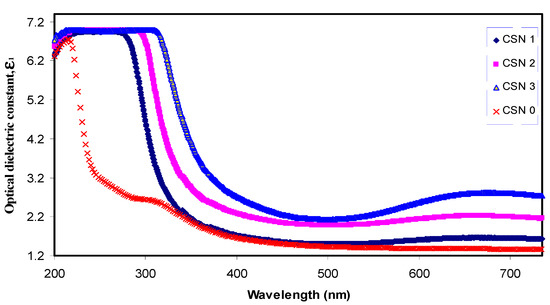 Figure 8 shows the optical dielectric constant (ε1) versus wavelength. From the graph, an obvious increase in dielectric constant upon the incorporation of CuI content can be seen. Such an increase is related to the increment of the density of states since ε1 can be directly associated with the density of states inside the forbidden gap of the solid polymer films [43]. Previous studies established that ε1 is related to the electronic part and depends strongly on the optical bandgap [28,44]. This can be better understood from the well-known Penn model [45], as given by: