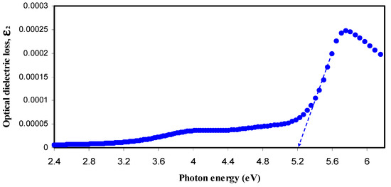 The optical band gap has been studied by other researchers both experimentally and theoretically [50,54]. They observed that the experimental values for the band gap energy are found to be larger than the theoretical values. They have attributed this discrepancy to neglecting excitons and to poor description of strong Coulomb exchange interaction among electrons. The measurable optical dielectric loss has been used experimentally due to the shortcoming of the quantum models. In our previous works, the optical dielectric loss from the measured quantities, such as refractive index (n) and extinction (K) coefficient (ε2 = 2nK), has been successfully used to estimate the optical band gap. From the quantum mechanical viewpoint, Equation (4) was found to be a microscopic approach for the study of band-gap and required lengthy numerical methods. By contrast, it is found that using the experimental value of optical dielectric loss (ε2 = 2nK), which is a macroscopic approach, is easier and more accurate method to estimate the optical band gap [28,46].