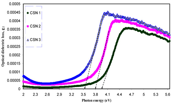 Figure 9 and Figure 10 show the optical dielectric loss versus photon energy for pure- and doped-CS samples. It is well established that crystalline materials have sharp structures in the fundamental absorption region, whereas amorphous materials exhibit broad peaks [55]. Compared to the doped samples pure CS has exhibited a sharp peak. This is related to the existence of large amount of crystalline fraction in pure CS [56,57,58]. In our previous work, broad peaks in the plot of optical dielectric loss have been observed due to the amorphous nature of the composite samples [28,46]. The broad peaks depicted in Figure 10 may be ascribed to the amorphous structure of the samples. The estimated band gaps from the optical dielectric loss plots are presented in Table 2. To specify the type of electronic transition, Tauc’s method must be studied.