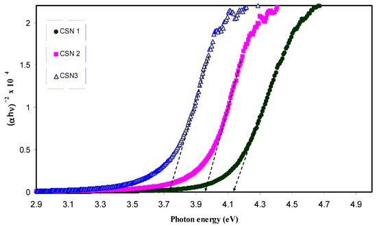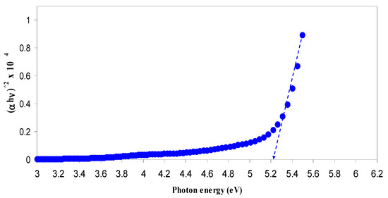 where β is a constant and Eg is the optical energy bandgap. The exponent γ may have values of 1/2, 2, 3/2 and 3, which correspond to the allowed direct, allowed indirect, forbidden direct and forbidden indirect excitations, respectively [46]. Thus, from Tauc’s relation, four figures can be plotted to specify the type of transition. In this work, the plot corresponding to allowed direct excitation (γ = 1/2) is only presented due to that the plots corresponding to other values of γ exhibit optical band gaps that cannot be compared with those achieved from the optical dielectric loss plots (Figure 9 and Figure 10).